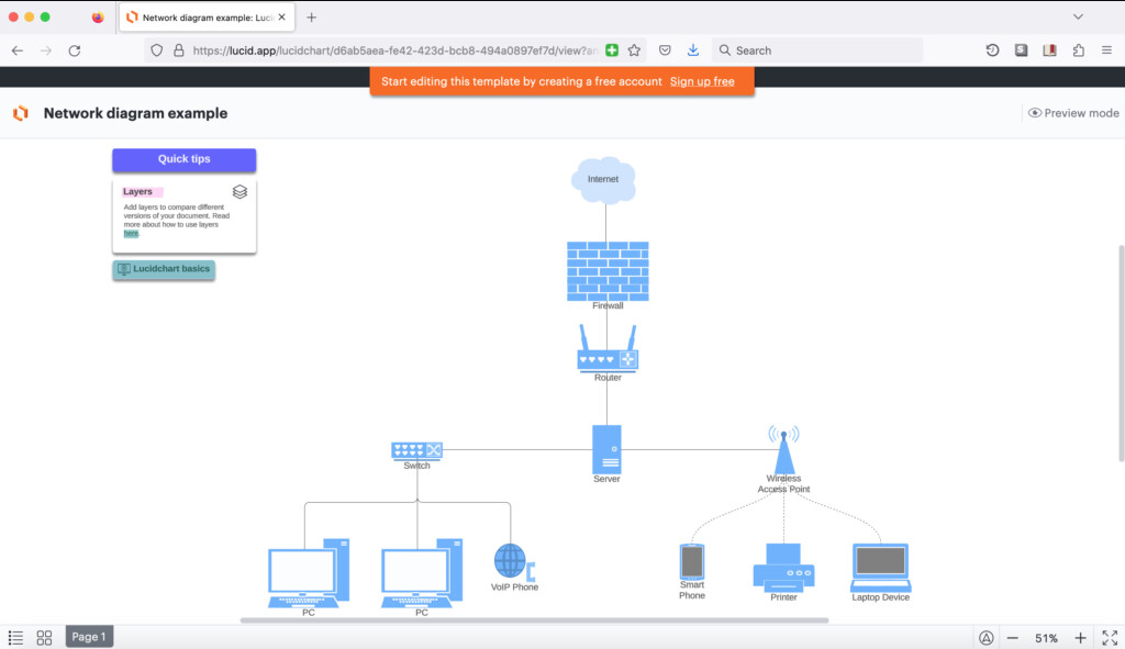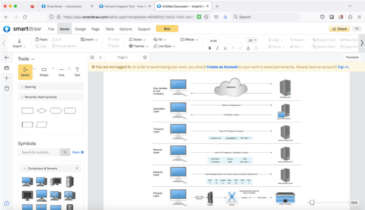SmartDraw is one of the most powerful yet intuitive diagramming tools we’ve used. It’s the leading Visio alternative for Mac and makes drawing network diagrams remarkably simple. It stands out as the only tool we tested that reliably imports and exports Visio (VSDX) files without formatting issues.SmartDraw supports automated diagramming through integrations with AWS and Azure—allowing you to generate network maps automatically. It includes dedicated templates and icons for Cisco, Azure, Google Cloud, and more. You can drag and drop devices like routers, switches, and servers, and use the connector tool to illustrate relationships clearly.