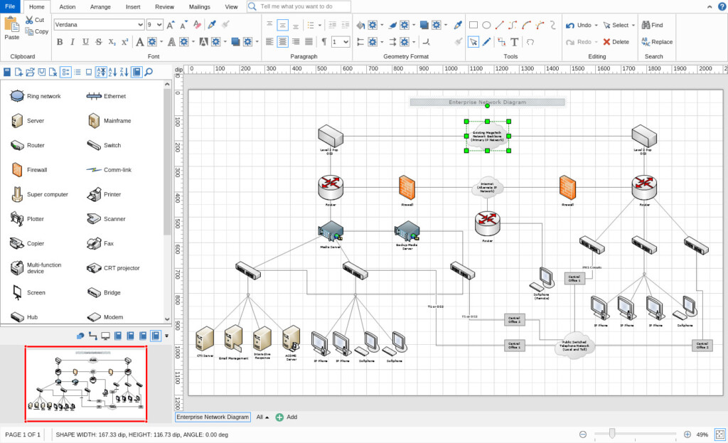 A completely free and open-source tool with impressive capabilities—including AWS, Azure, and Cisco shape libraries. It supports Bus topology and imports/exports Visio VSDX (with occasional formatting issues).