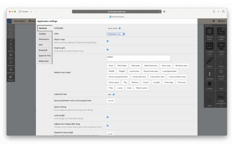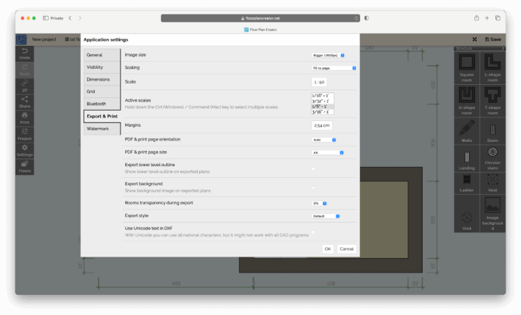 Under Settings > General > Units, you can switch between metric and imperial measurements. Export options include PDF, though higher-resolution images and DXF support are reserved for paid subscribers.
