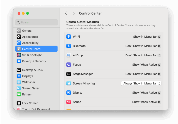 - Add Screen Mirroring to the Menu Bar: Go to Apple Menu → System Settings/Preferences → Control Center (or Dock & Menu Bar in Monterey) → Enable Screen Mirroring for quick access.