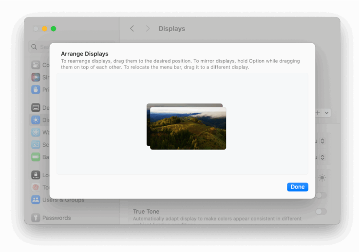 - Arrange Displays (if needed): Go to System Settings → Displays → Arrangement → Drag the blue rectangles to match your physical screen layout.