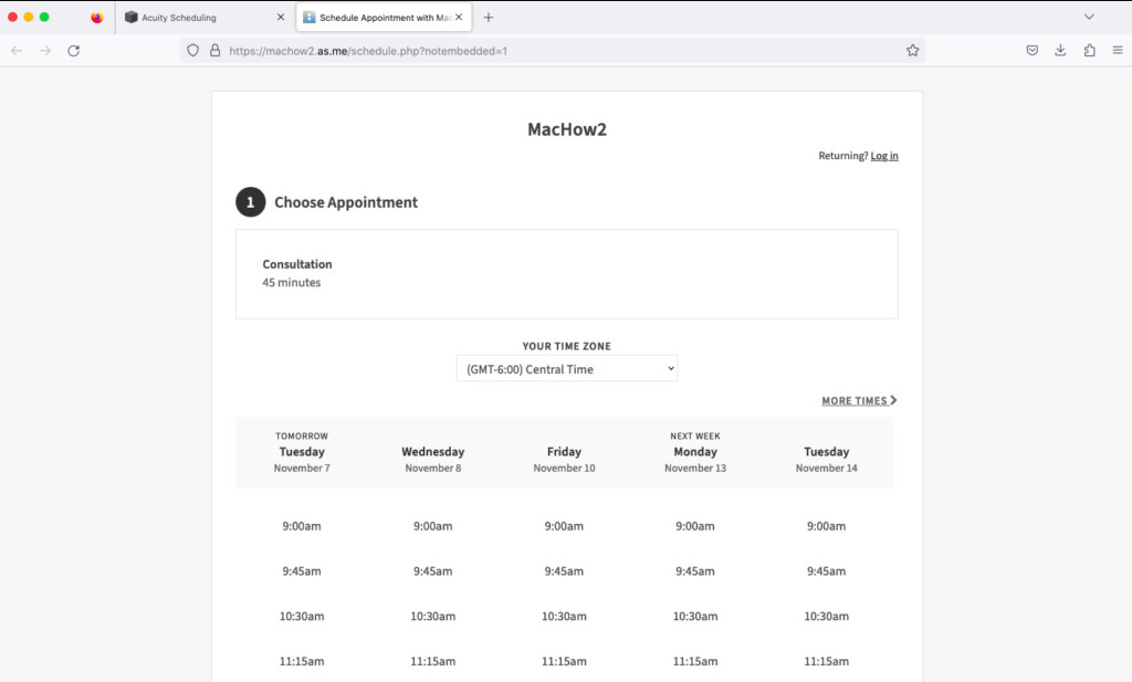 Acuity Scheduling is a powerful and user-friendly tool that works seamlessly on Mac. Now part of Squarespace, it integrates smoothly with websites, allowing you to embed real-time booking pages directly into your site.It supports sync with iCloud, Google, and Outlook calendars, helps avoid double-booking, and lets clients schedule, reschedule, or cancel appointments online. Additional features include customized intake forms, group sessions, recurring appointments, and payments via Stripe, PayPal, or Square.