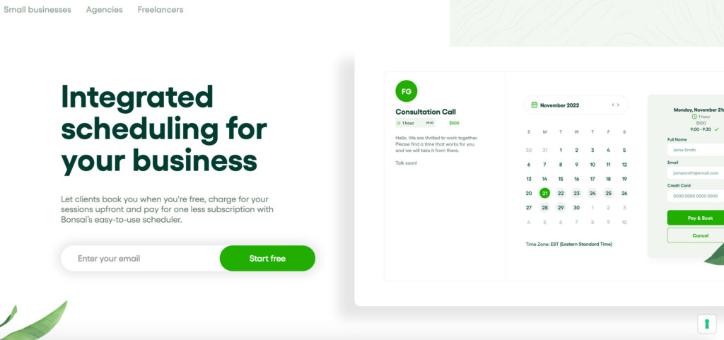 Bonsai combines scheduling with built-in invoicing and CRM tools, making it a great all-in-one solution for freelancers and small businesses. Clients can book, reschedule, and pay online.You can also require advance payment to avoid no-shows and use time tracking and contract templates—all within the same platform.